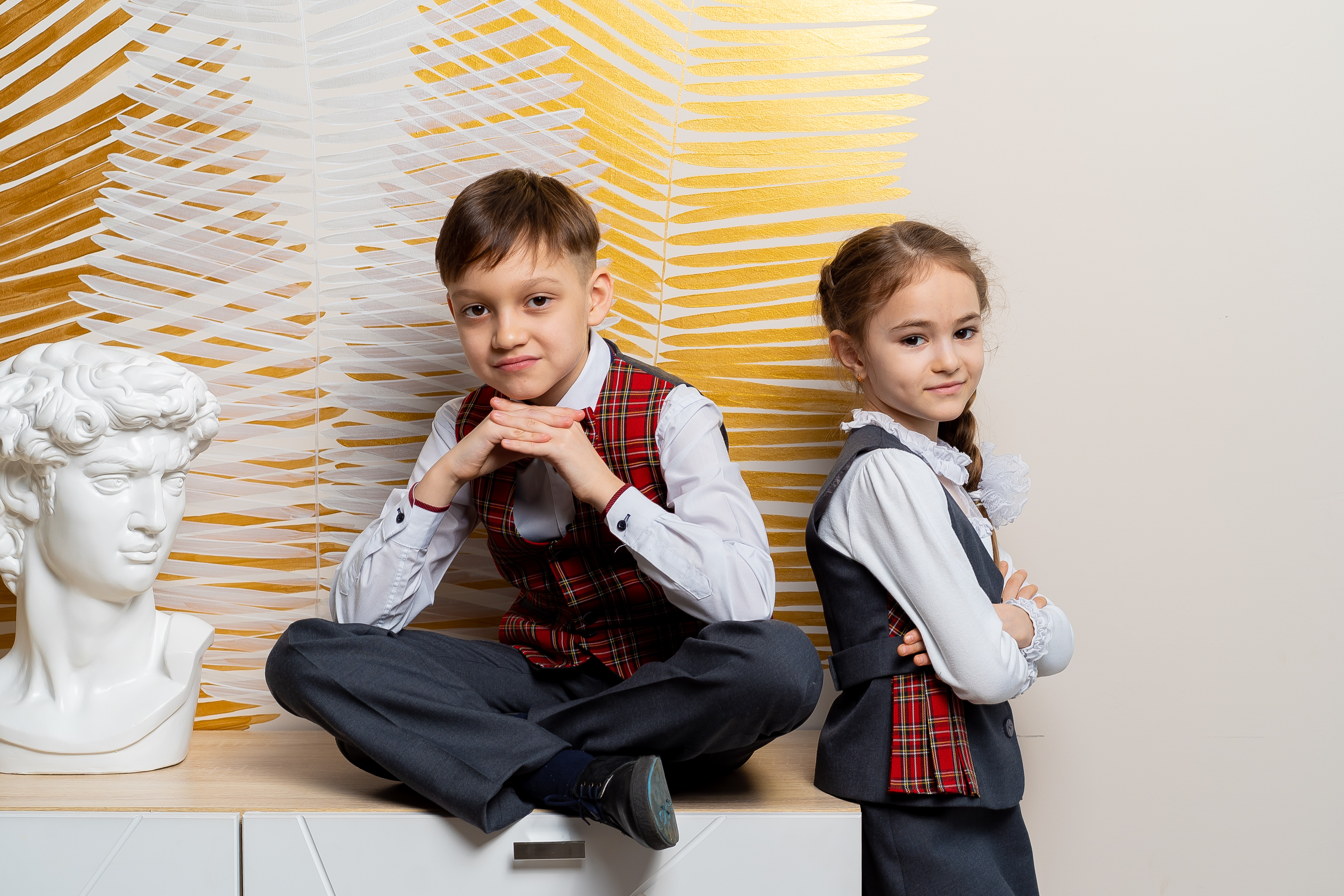 Мальчики: брюки классического кроя серого цвета (допустим черный и синий цвет), жилет серый с эмблемой образовательного учреждения в красную клетку (шотланка), мужская сорочка (рубашка) или водолазка, туфли (ботинки). Рубашка или водолазка однотонная, светлых оттенков, аксессуары (галстук, поясной ремень).