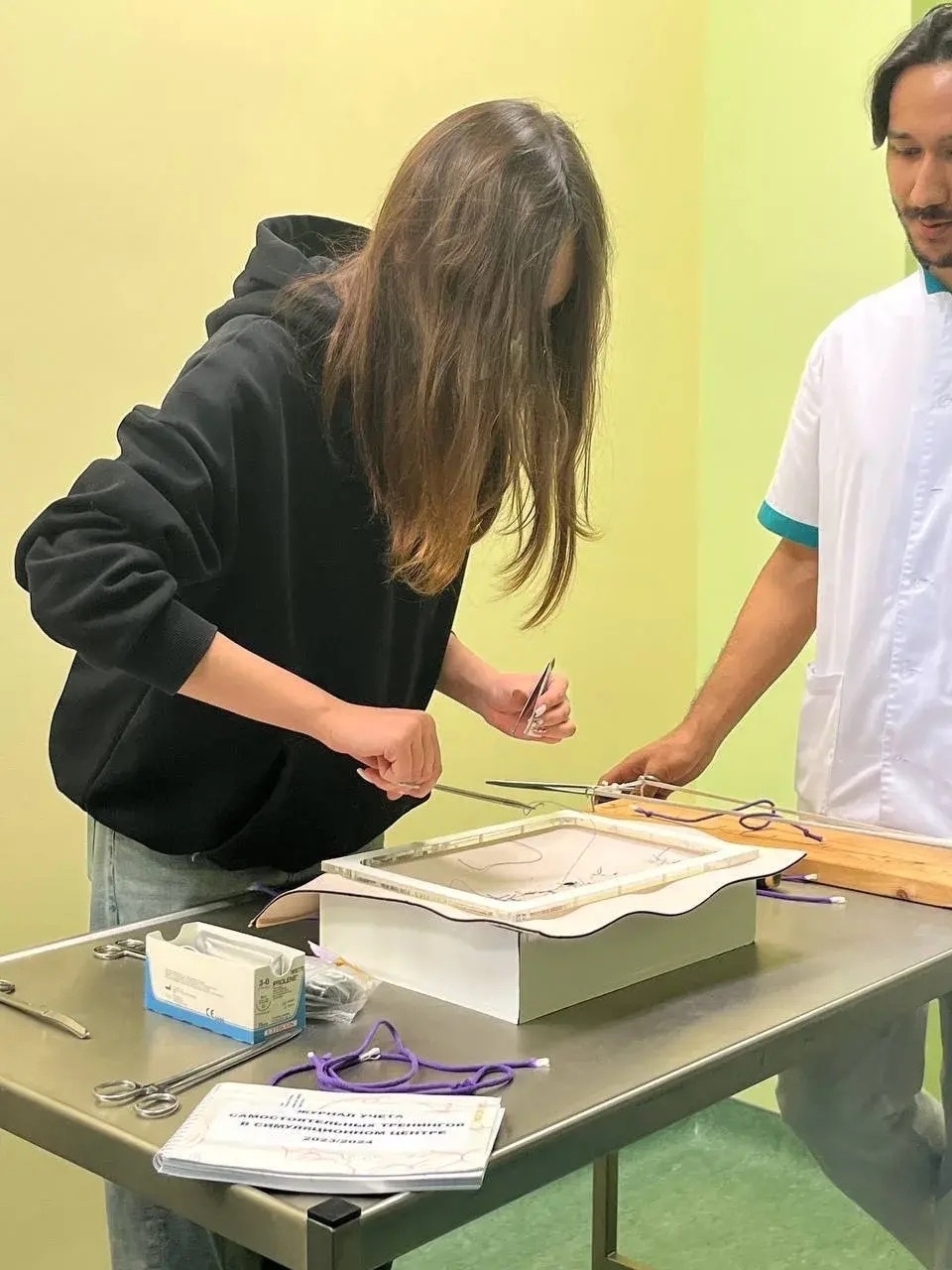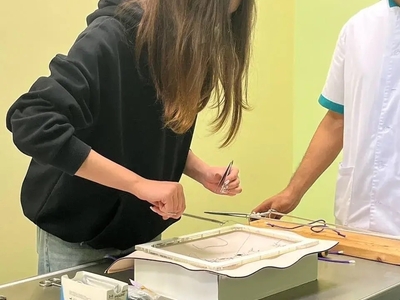 Также девочкам очень подробно и доходчиво рассказывали, насколько важен правильный узел в хирургии. Это не просто деталь, а основа безопасности, надёжности и скорости операции. По словам лектора узел должен быть прочным, не распускаться, не сдавливать ткани чрезмерно и быть завязанным максимально быстро. Со стороны всё выглядело невероятно просто, но им предложили повторить и это оказалось задачей не из лёгких!